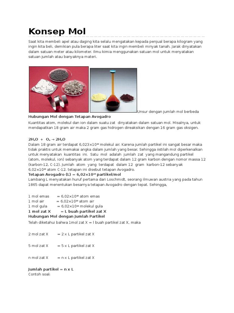Dalam kehidupan sehari-hari mol dapat dianalogikan sebagai lusin. Berdasarkan kesepakatan untuk partikel yang jumlahnya sebesar tetapan Avogadro atau 602 10 23 dinyatakan sebesar satu mol. Konsep Mol dan Tetapan Avogadro.