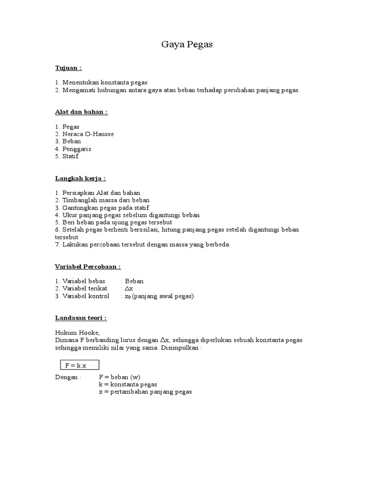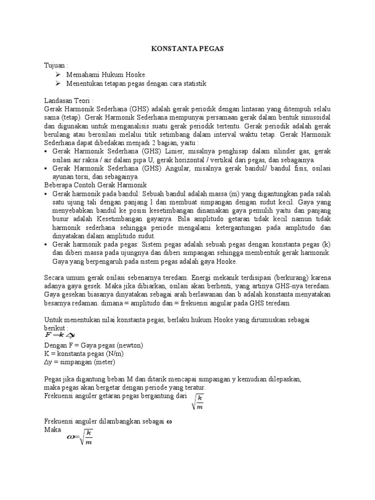 TETAPAN PEGAS DAN BANDUL MATEMATIS Maksud Menentukan tetapan pegas dengan menggunakan hukum Hooke. Untuk menentukan nilai dari tetapan pegas tersebut dapat dilakukan dengan 2 cara yaitu cara statis dan cara dinamis. 619232 13604 Nm.