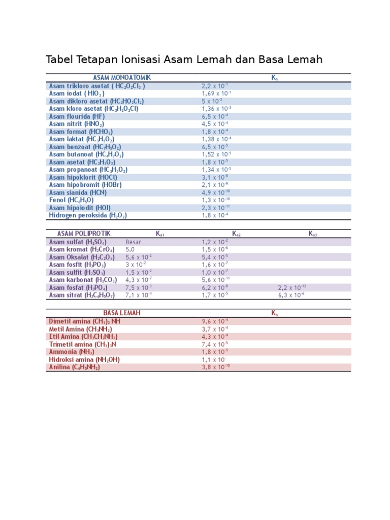 Tabel Tetapan Ionisasi Asam Lemah Dan Basa Lemah
