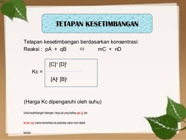 Tetapan Kesetimbangan Tekanan Parsial Kp Tetapan kesetimbangan K merupakan konstanta angkanilai tetap perbandingan zat ruas kanan dengan ruas kiri pada suatu reaksi kesetimbangan. Untuk setiap sistem kesetimbangan pada suhu tertentu perbandingan hasil kali konsentrasi zat. Apabila pada sistem kesetimbangan yang berlangsung diberi suatu aksi maka akan timbul reaksi dari sistem sehingga memperkecil aksi tersebut C.