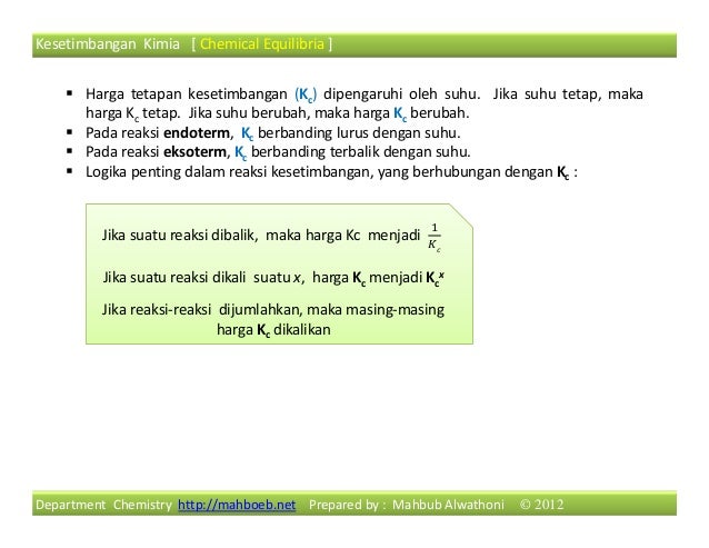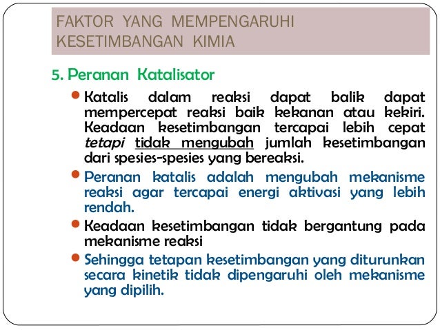 Tetapan kesetimbangan dipengaruhi oleh. Konstanta kesetimbangan reaksi tidak dipengaruhi oleh adanya katalis atau enzyme katalis biologis yang hanya mempercepat tercapainya kesetimbangan. Nilai tetapan kesetimbangan reaksi tidak dipengaruhi oleh fase padat s dan fase cair l. Nilai Kc dan Kp hanya dipengaruhi oleh suhu jika suhu tetap maka K tetap.