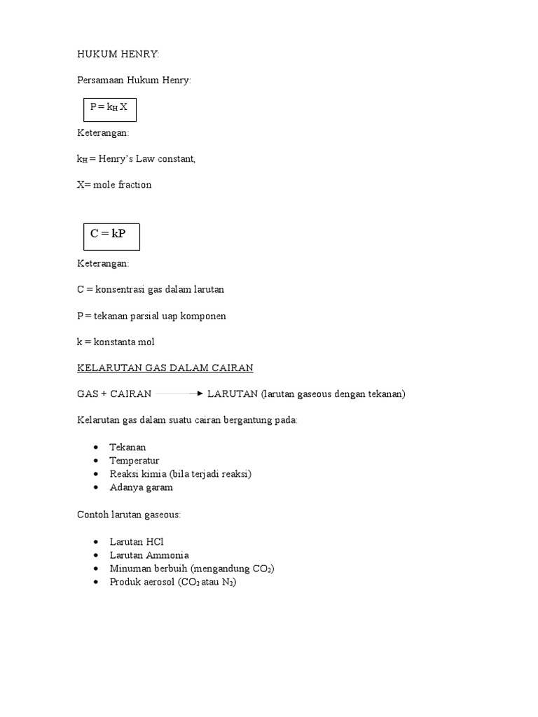 Karena tingginya tekanan parsial CO2 di dalam. Zat terlarut memenuhi hukum Henry Persamaan 129 dengan K CS2 tetapan hukum Hendri untuk CS 2 jadi dari kurva tekanan uap tersebut dapat dinyatakan bahwa. Kelarutan gas dalam cairan dapat dinyatakan dengan menggunakan tetapan Henry.